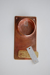 The clasp was made by cutting out a large disc of milled copper, cutting out an offset smaller circle and then doming the piece in my dapping block.